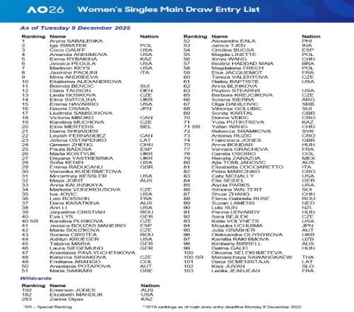 北京时间12月9日,澳大利亚网球公开赛官方公布2026澳网男、女单正赛入围名单。中国选手共有7人入围单打,女单4人,男单3人。本届赛事,爱奇艺体育将全程直播。