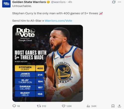 此役37岁的老萌神又迎来了一个全新的里程碑,他成为NBA历史上第一位达成400场5+三分球的球员断崖第一,第二的哈登只有214次,这就是三分之神的恐怖实力。