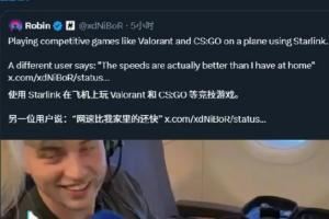 电竞体育1月16报道 马斯克转载用户在飞机上使用星链体验无畏契约和CS的视频,视频中用户表示除了能够流畅游戏外,网速甚至比家里还快。