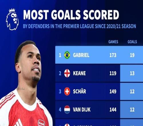 2021赛季以来英超后卫进球榜:加布里埃尔19球第1,范戴克第3